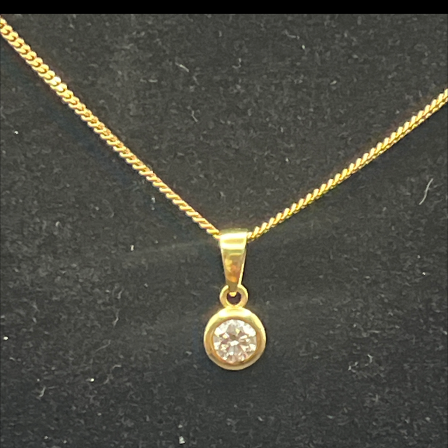An 18ct gold necklace set with a single round brilliant-cut diamond in a smooth bezel setting. The pendant is understated and well-proportioned, allowing the diamond to sit securely while catching the light cleanly. Suspended from a fine gold chain, the design is timeless and easy to wear, equally suited to everyday use or layering. Fully hallmarked. A classic solitaire necklace with enduring appeal.