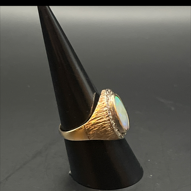 A 9ct gold ring set with an oval opal, framed by a halo of diamonds. The opal displays lively flashes of blue and green, with a softly textured surface that adds depth and movement as the light shifts. The shoulders of the band feature subtle textural detailing, giving the ring a sculptural quality typical of mid-1970s design. Fully hallmarked for 1975. A bold yet wearable piece with strong period character and presence.