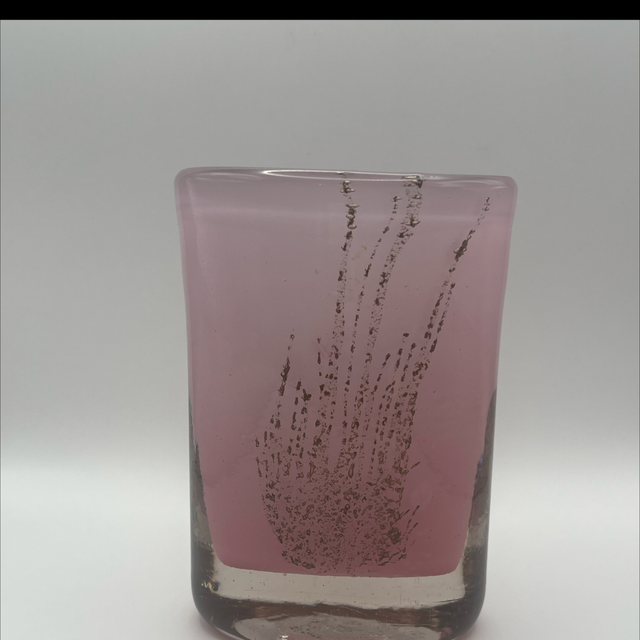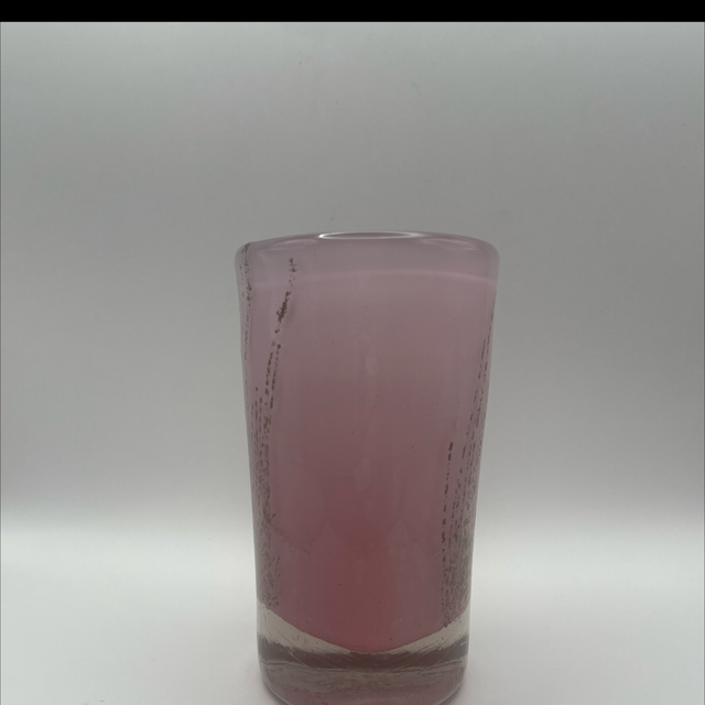 Benny Motzfeldt vase in soft pink glass, approximately 14cm tall, featuring organic internal inclusions rising from the base and encased within clear glass. The interior detailing creates depth and movement within the form, characteristic of Motzfeldt’s sculptural approach to studio glass.