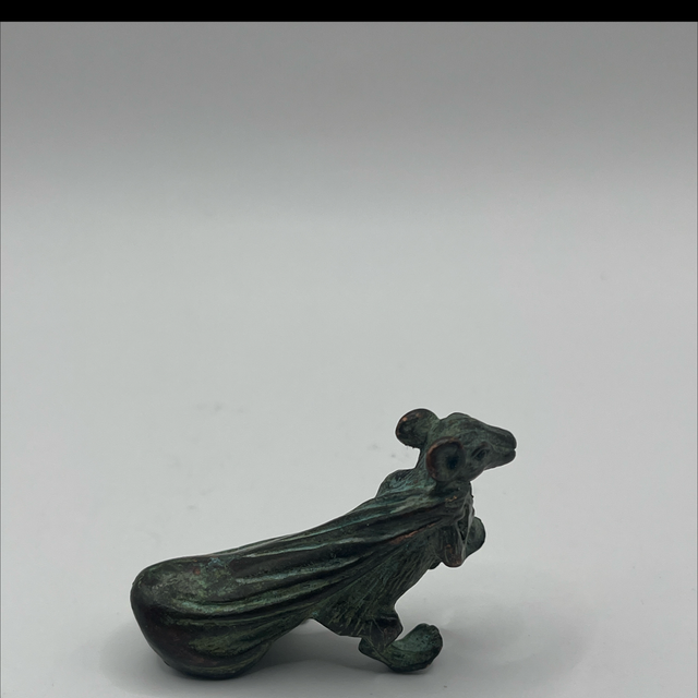 quirky and characterful bronze rat figure carrying a sack, finished with a lovely green patina that gives it an aged, antique-style look. Despite its small size, it has great detail and a fun sense of personality, making it a perfect little display piece.