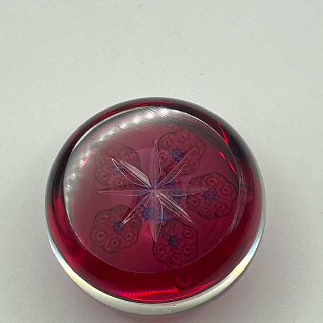 A beautifully made paperweight by featuring a deep ruby base with colourful millefiori canes arranged in a central rosette surrounded by five flower-like clusters. The star-cut base catches the light, giving the piece an extra sparkle when displayed.