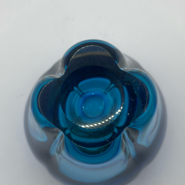 Whitefriars molar vase in blue glass. The form is smooth and rounded, with the distinctive profile that gives the design its name — reminiscent of a molar tooth. The surface is untextured, allowing the colour and curvature of the glass to define the piece.